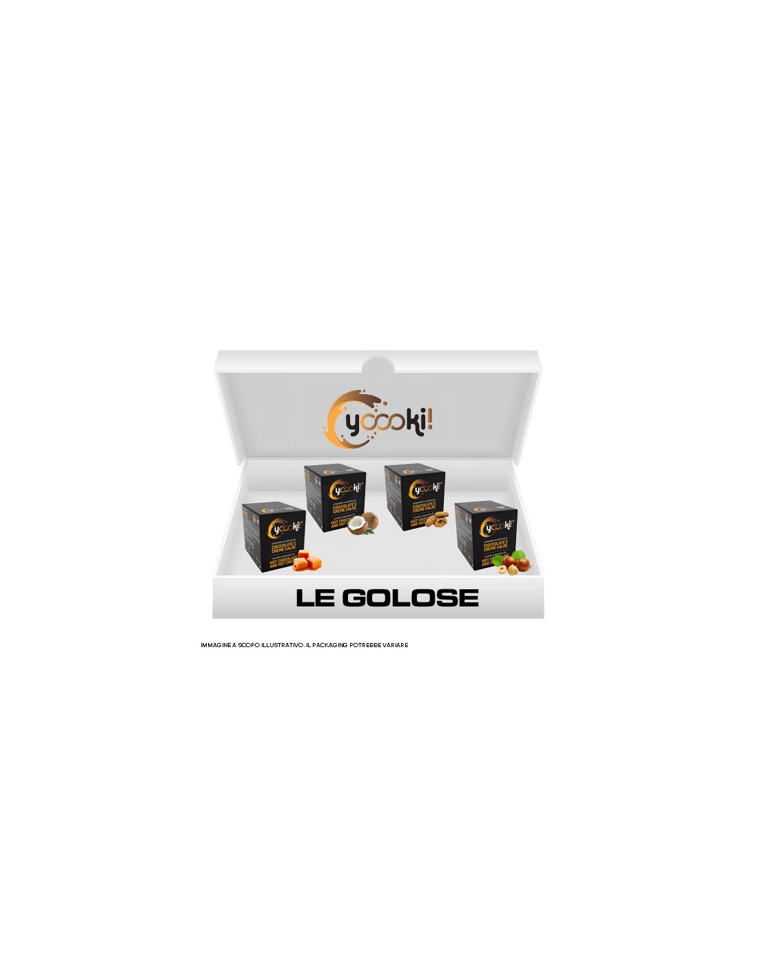Ingredienti gusto "Bianca Caramel-Mou": Zucchero, cacao in polvere (21%), amido di mais, aromi, sale, antiagglomerante:E551. Potrebbe contenere tracce di: latte e uova.