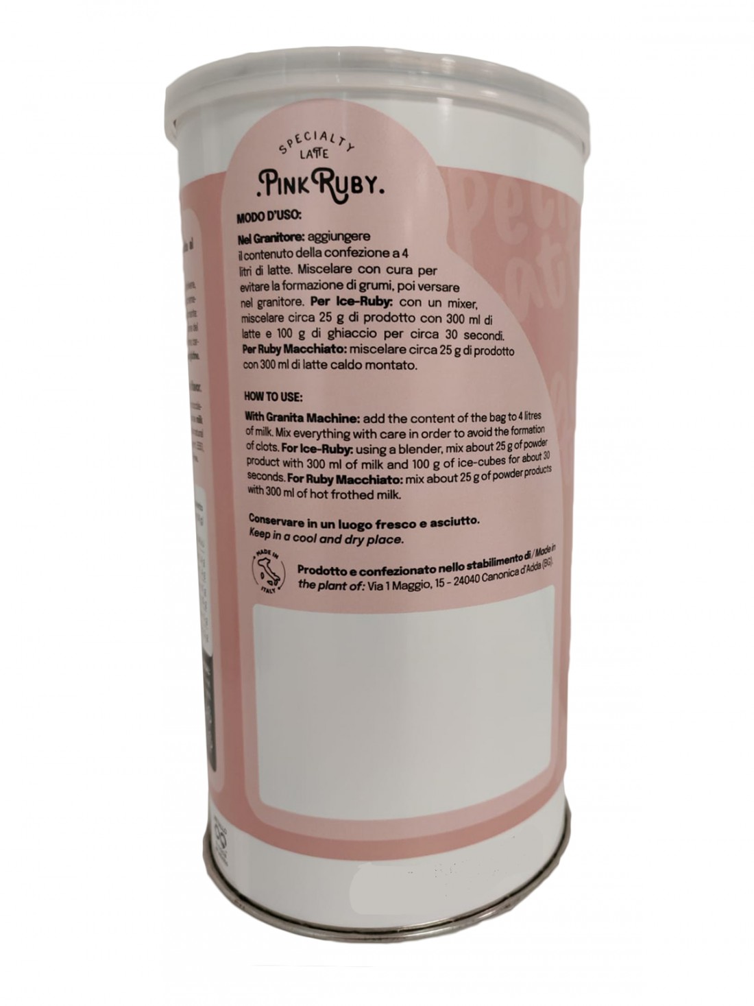 Ingredienti: Zucchero, maltodestrine, latte scremato in polvere, cioccolato ruby in polvere 6% (zucchero, burro di cacao, latte scremato in polvere, latte intero in polvere, pasta di cacao, emulsionante: lecitina di soia, acido citrico, aroma naturale di vaniglia), proteine del latte, aroma, addensante: E412, antiagglomerante: E551, colorante: carminio di cocciniglia.